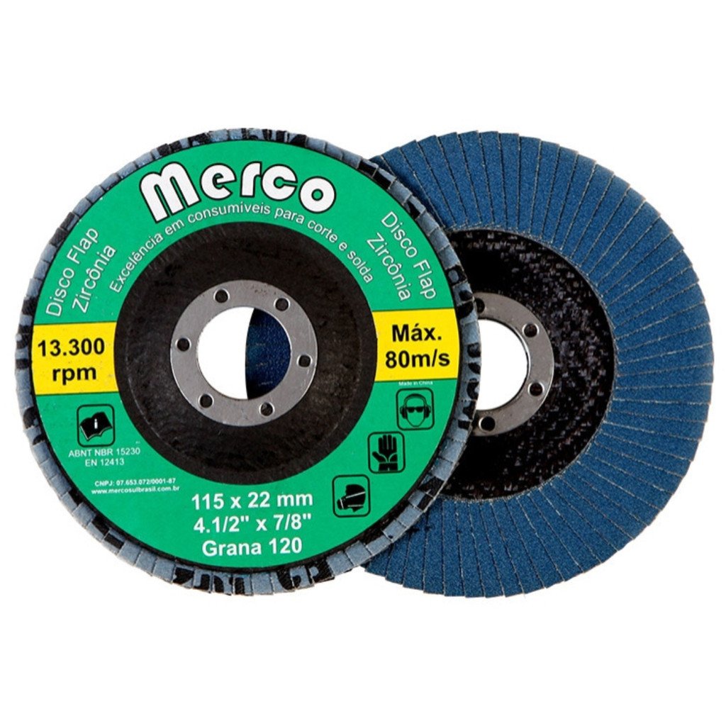 Disco Flap modelo GR-120 Zirconado da marca MERCO, com diâmetro de 4.1/2", indicado para desbaste, acabamento e polimento de superfícies metálicas; Fabricado com abrasivo zirconado de alta qualidade, oferece maior durabilidade, eficiência e acabamento superior em processos industriais; Ideal para uso em esmerilhadeiras e ferramentas rotativas, garantindo corte rápido e seguro.