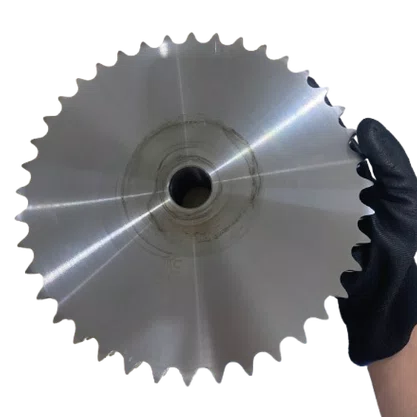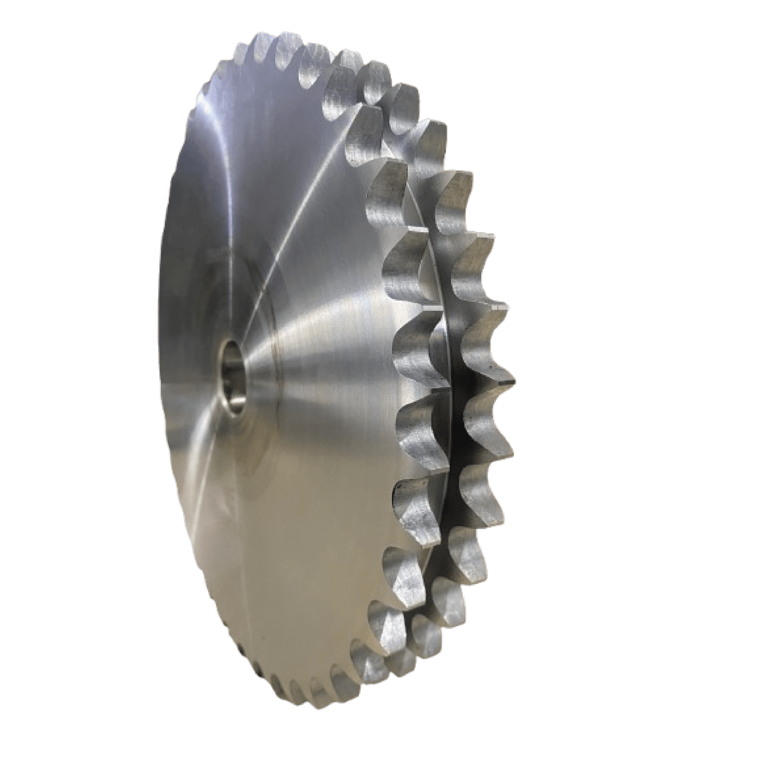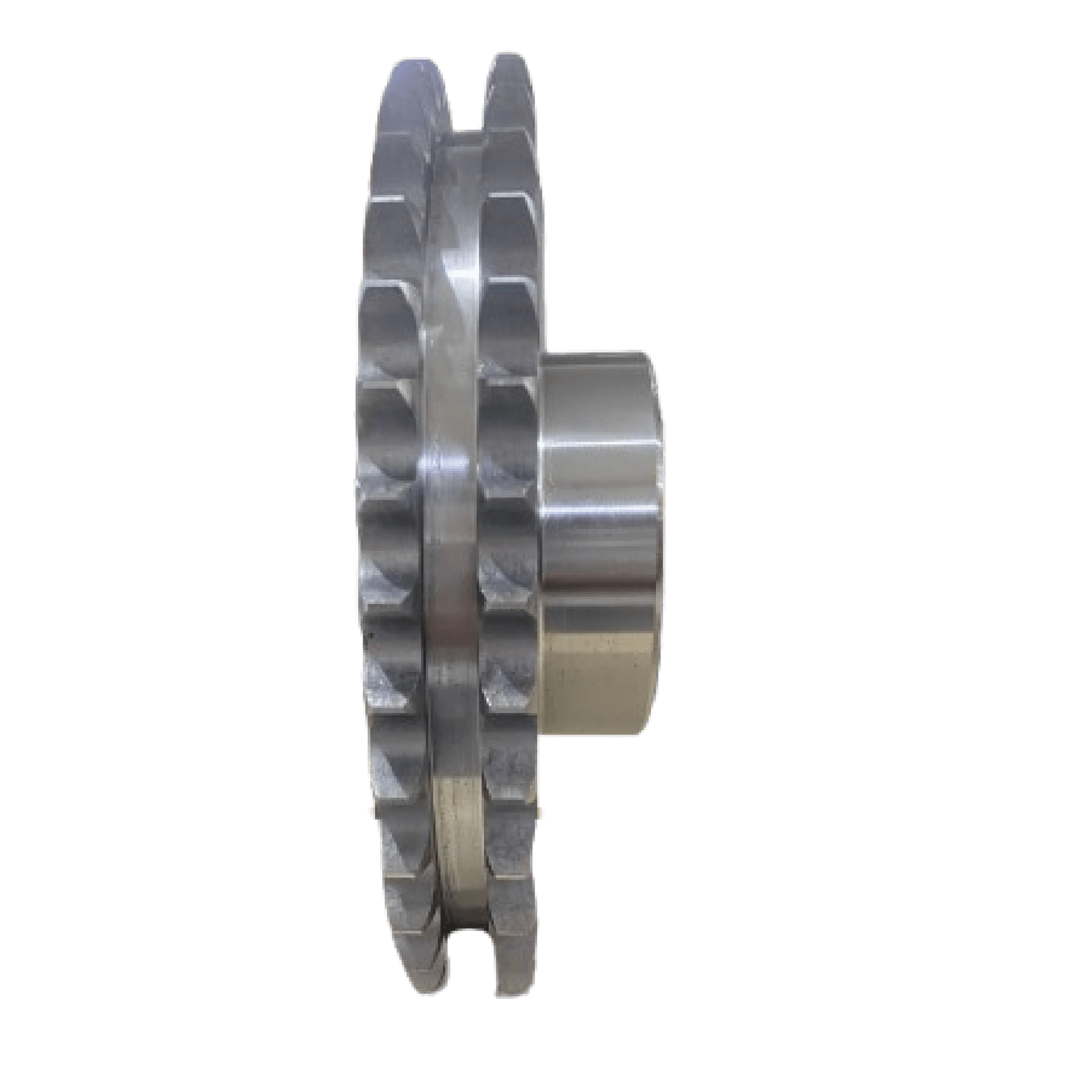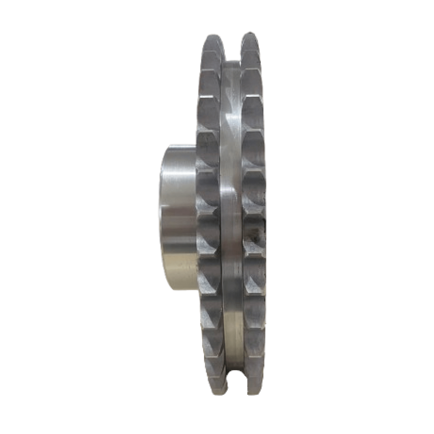 Engrenagem para Corrente Dupla é um componente cilíndrico dentado usado em sistemas de transmissão por corrente, em que seus dentes se encaixam nos elos da corrente para transmitir movimento rotativo de um eixo para outro.