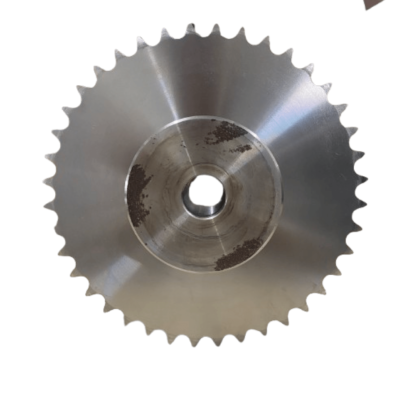 - Configuração: dupla pista de dentes (para corrente duplex) com cubo tipo AT2 para montagem fixa no eixo.